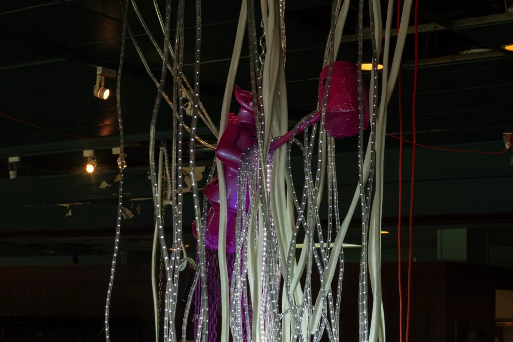 There’s a pink statue of what appears to be the Western Exterminator mascot, Mr. Little, strung from the ceiling with lights, chains, wires, and a picture of a house on fire. Every couple of minutes, a mournful vocal track from a pop song plays over a speaker sitting at the booth below. Mr. Little looks like an angel, ascending to heaven. The whole thing feels a bit Richard Kelly in its theatricality. Is this Buñuel’s exterminating angel? Have we been left behind, ghost of the American Dream?