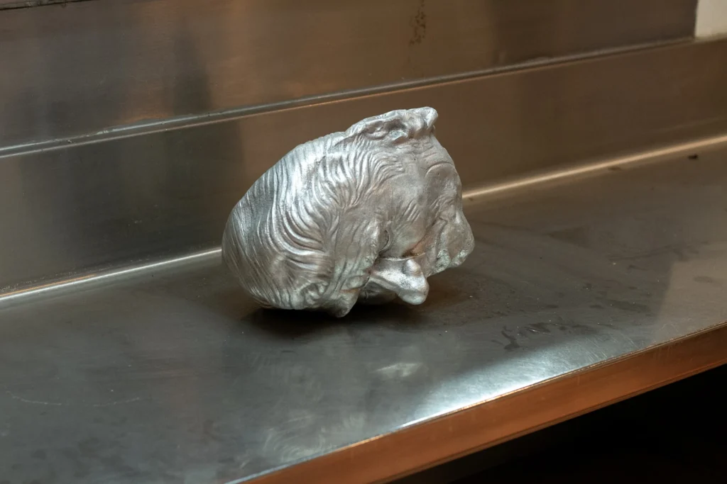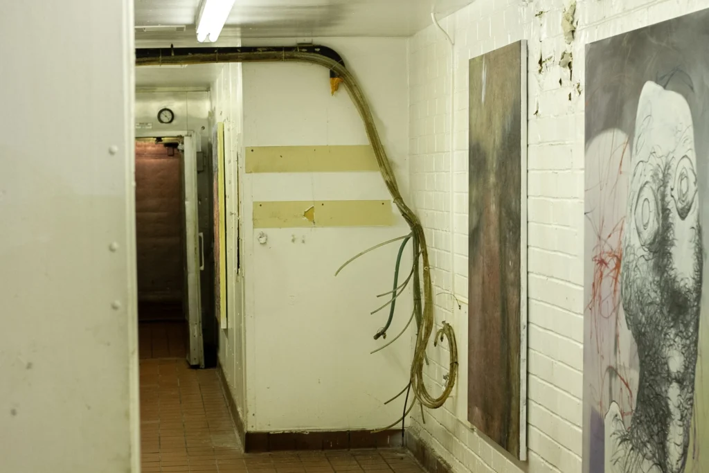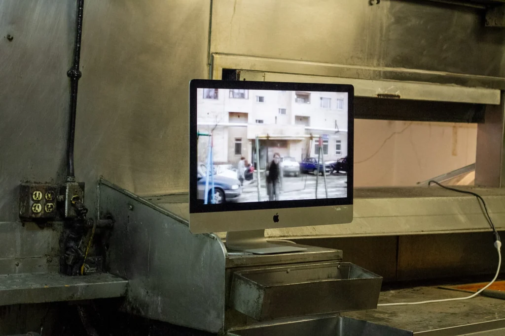 In the kitchen, a computer monitor loops a person swinging in front of a bleak apartment building set to an ominous drone. The video loop is shorter than the music, and the disjunction robs both of an ending, making the whole thing eternal. Is this a commentary on the repetitive tasks of the chefs who labored in this very kitchen?